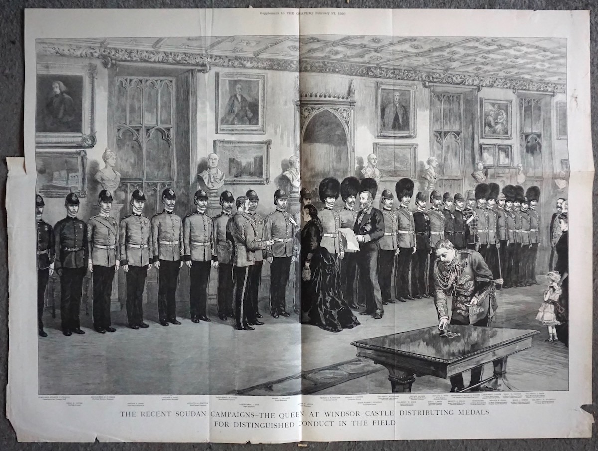 Antique Print, The Recent Soudan Campaigns the Queen at Windsor Castle Distributing Medals for Distinguished Conduct in the Field, 1886, 80 x 61 cm. Foldable.