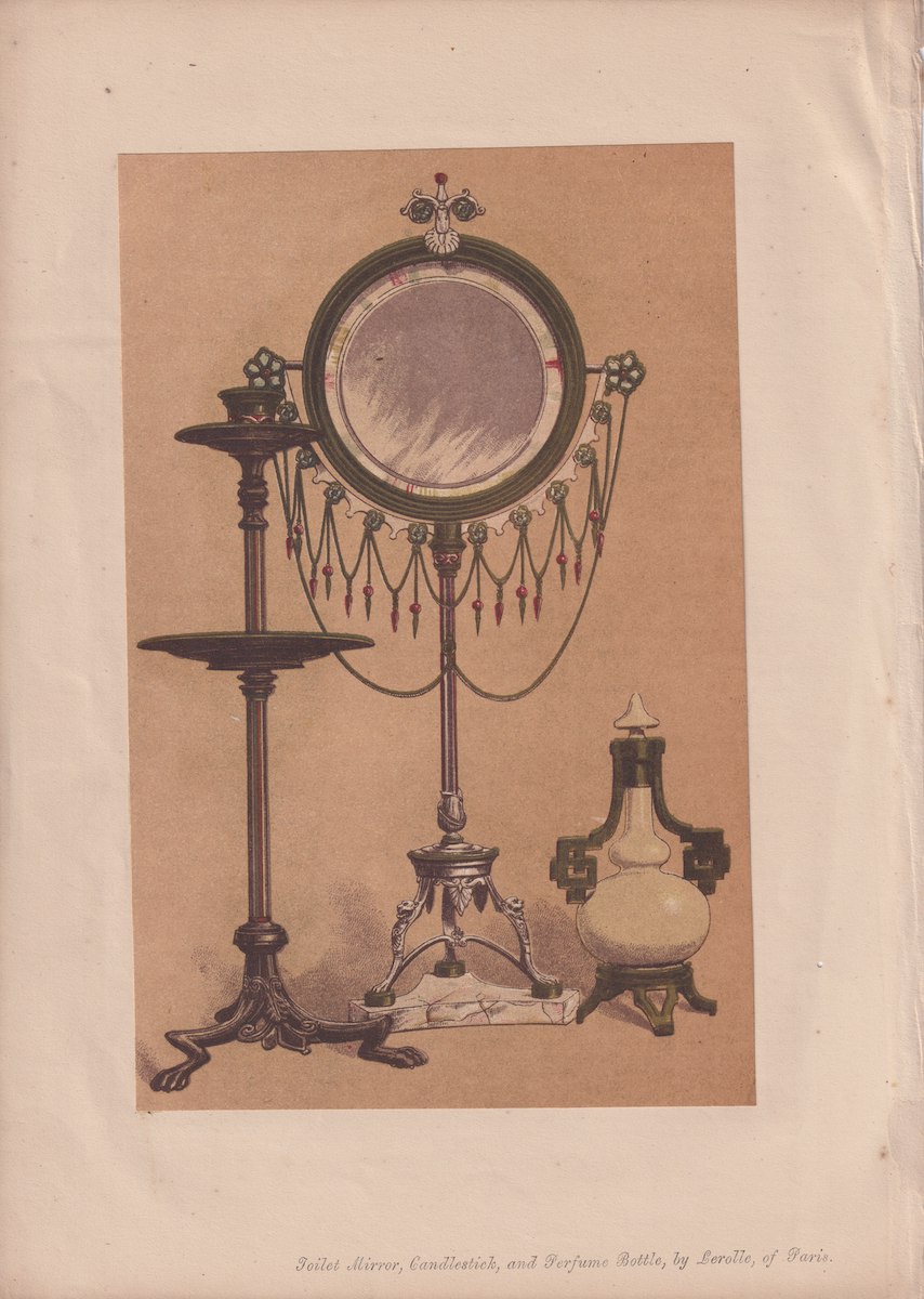 Antique Print, Toilet Mirror, Candlestick, and Perfume by Lerolle, of Paris, 1868, 28.5 x 20.5 cm.