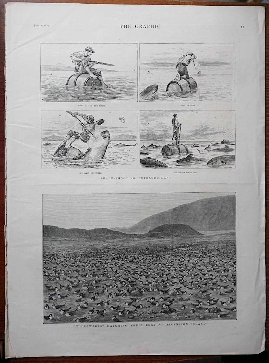 Antique Print, Wideawakes Hatching their Eggs at ascension Island, 1882; Shark -Shooting Extraordinary 39,6 x 28,7 cm.