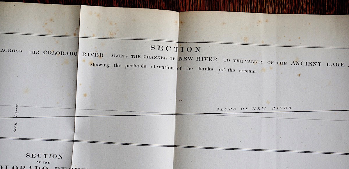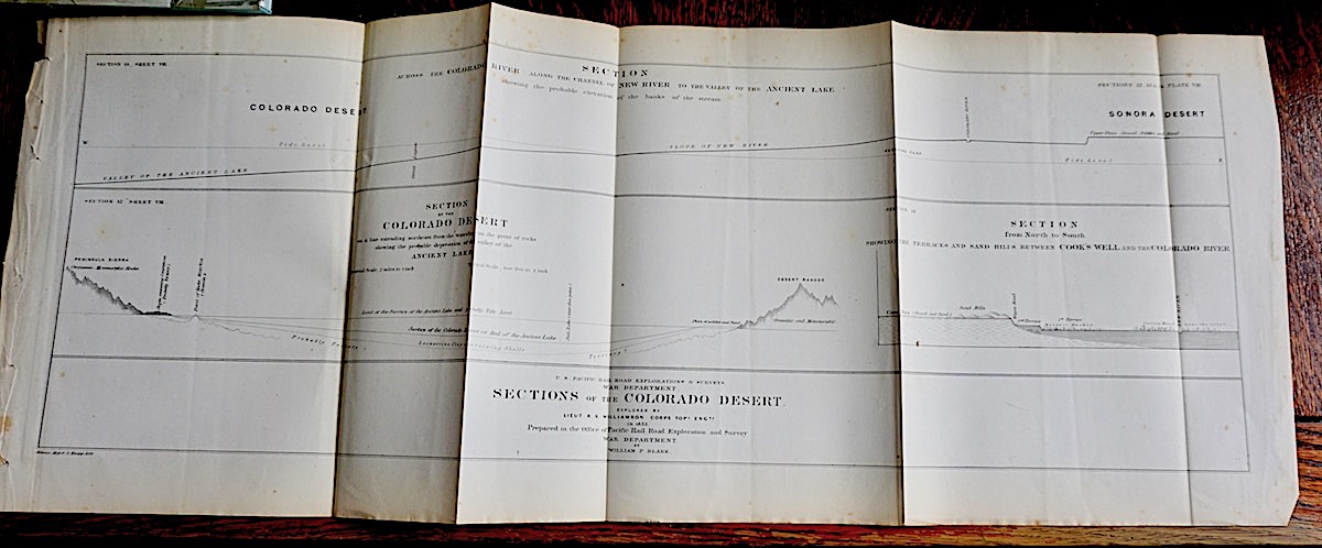 Antique Section Across the Colorado River along the Channel of New River to the Valley of the Ancient Lake showing the probable elevation of the banks of the stream, 1853; Section of the Colorado Desert on a line extending northeast from the waterline on the point of rocks showing the probable depression of the valley of the Ancient Like; Sections of the Colorado Desert explored by Lieut R.S. Williamson corps in 1853, prepared in the Office of Pacific Rail Road Exploration and Survey war department by William P. Blake. Foldable. cm. 76 x 29.