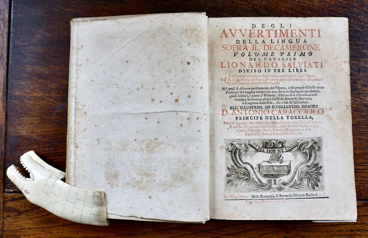 Degli Avvertimenti della lingua sopra il Decamerone, diviso in tre libri… Nella Stamperia di Bernardo-Michele Raillard, 1712, credit Antiche Curiosità©