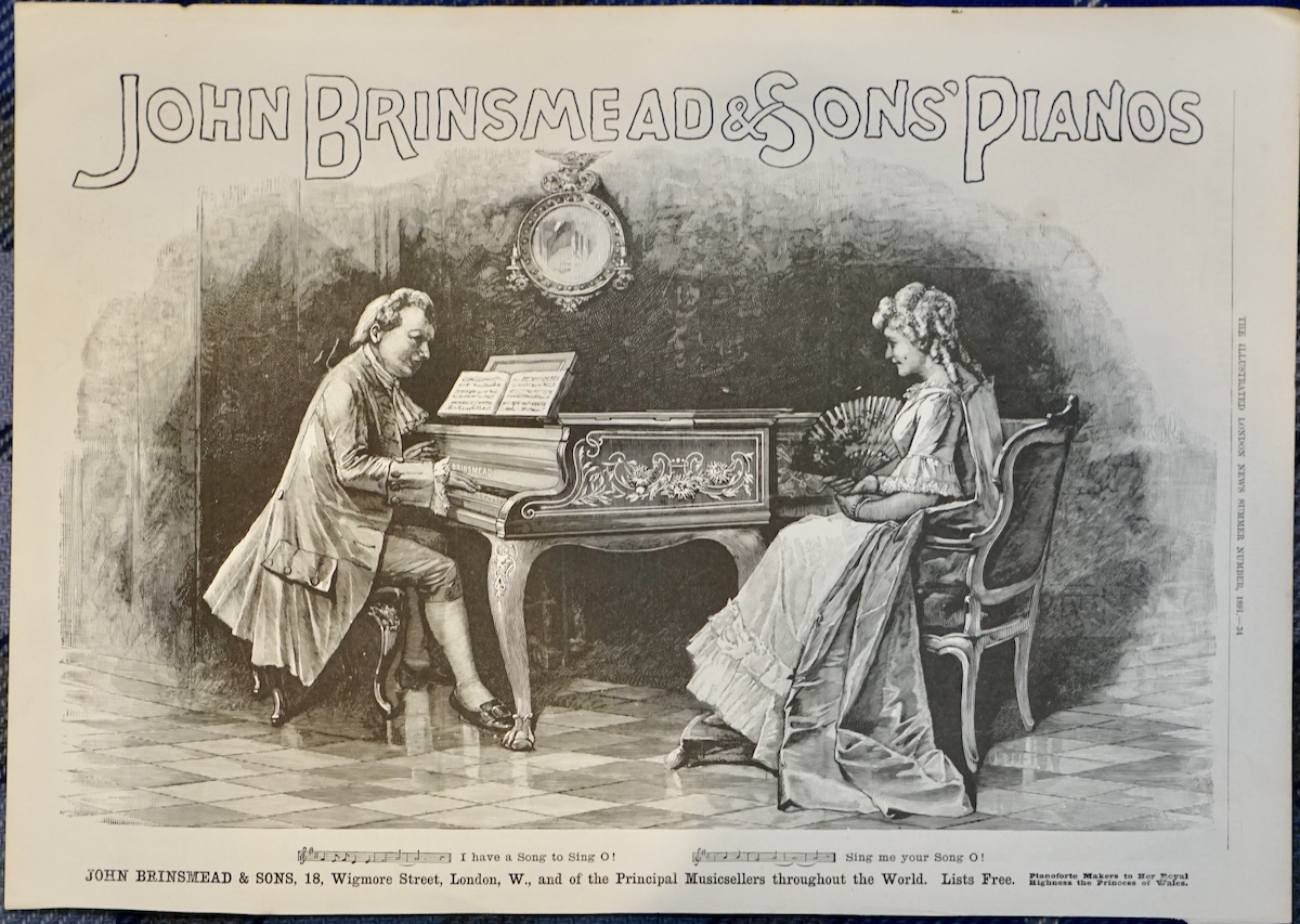 Elegant Victorian Piano Advertisement, 1891. Charming vintage print featuring an advertisement for John Brinsmead & Sons’ Pianos, a renowned London piano manufacturer. The image depicts a gentleman playing an ornate piano while a graceful lady listens, holding a fan. With its refined details, Victorian style, and period typography, this print is perfect for collectors, music enthusiasts, or vintage-inspired interiors, 39.5 x 29 cm.