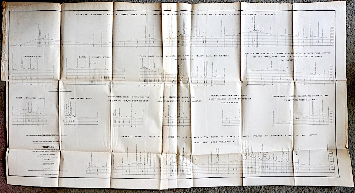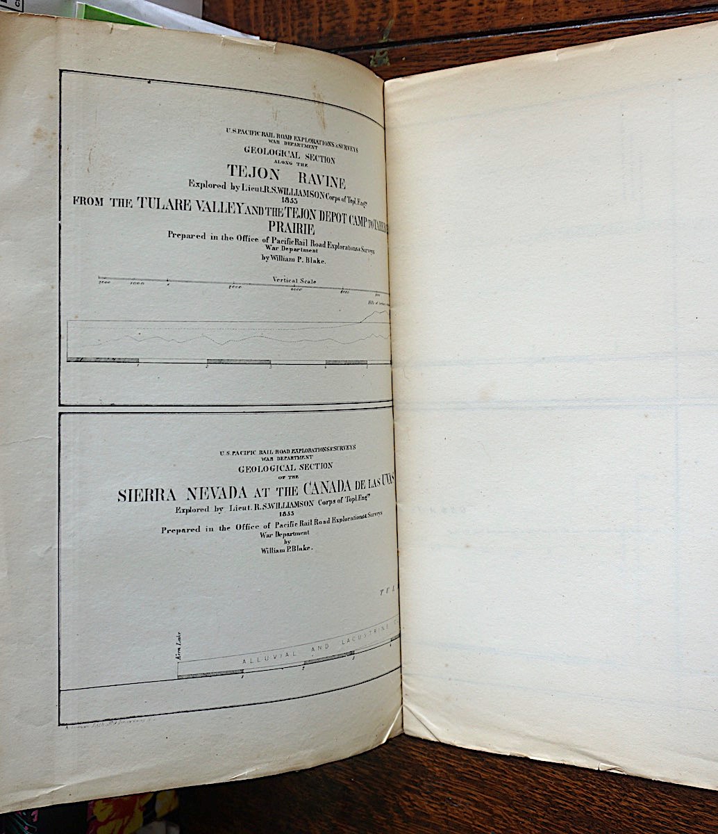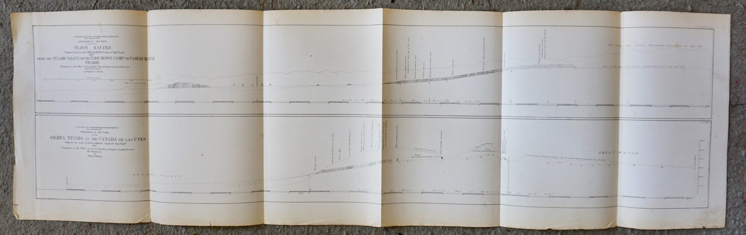 Geological section: Tejon Ravine, Sierra Nevada, 1853. This map shows two geological sections – the Tejon Ravine from the Tulare Valley and the Tejon Depot Camp to Taheechaypah Prairie, and the Sierra Nevada at the Canada de las Uvas. Produced in 1853 by William Blake, this map shows some of the results from the U.S. Pacific Rail Road Explorations & Surveys, as explored by R.S. Williamson, cm. 97 x 29.