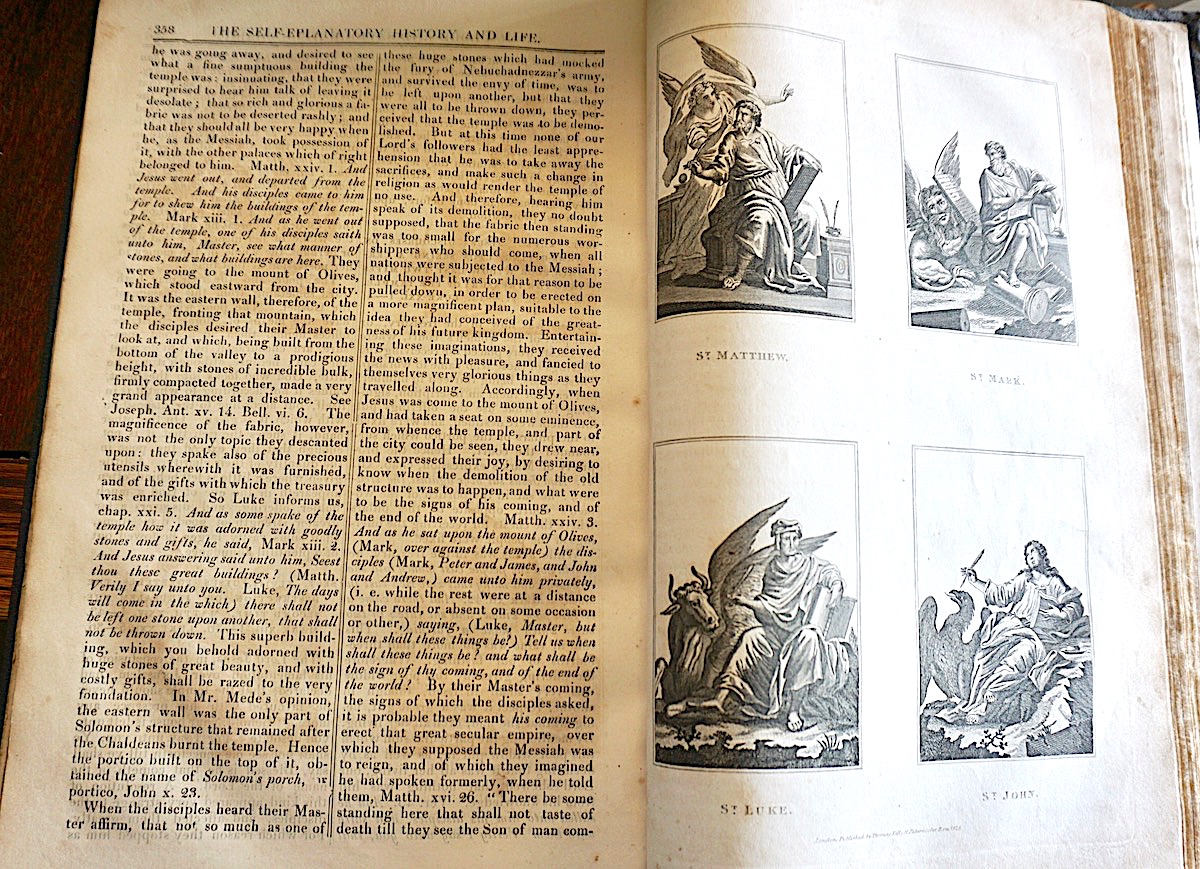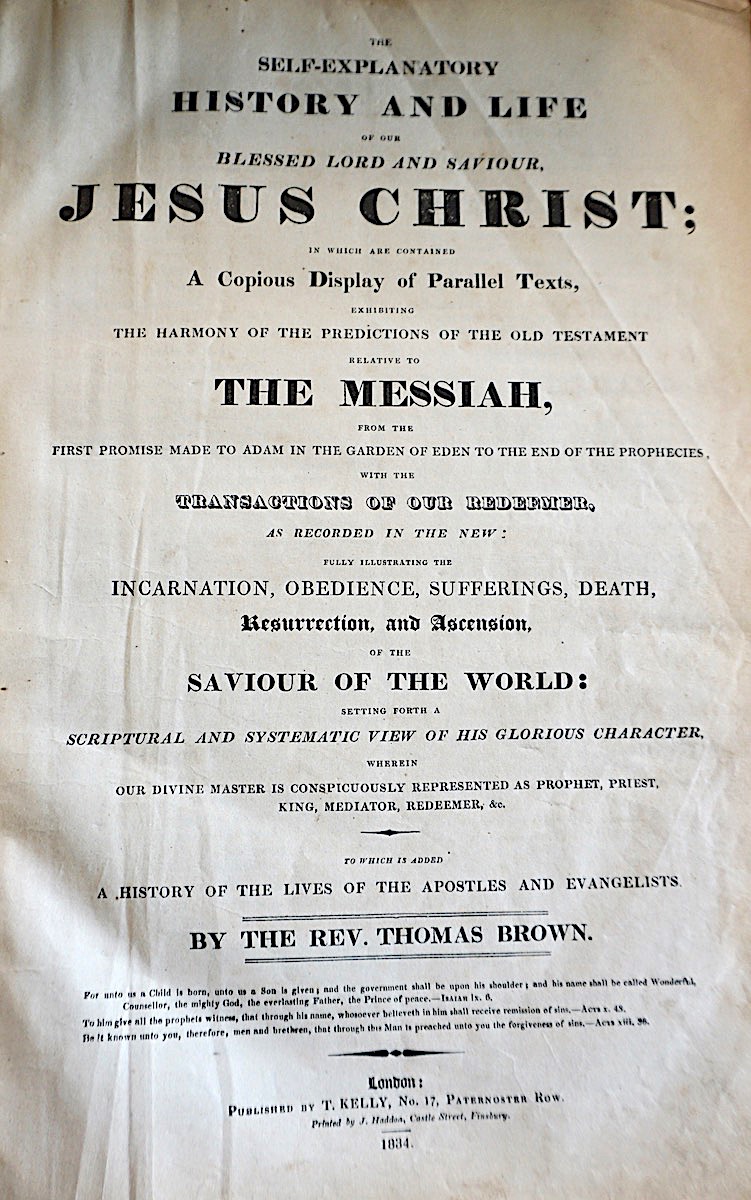 The self-explanatory History and life of our Blessed Lord and Saviour Jesus Christ; in wich are contained A Copious Display of Parallel Texts, Exhibiting the Harmony of the Predictions of the Old Testament relative to The Messiah, from the First Promise made to Adam in the Garden of Eden to the end of the Prophecies with the transactions of our redeemer as recorder in the new: fully illustrating the Incarnation, Obedience, Suffering, Death, Resurrection and Ascension of the Saviour of the world: setting forth a scriptural and systematic view of his glorious character, wherein our divine Master is conspicuously represented as prophet, priest, king, mediator, redeemer, & c. To which is added A History of the lives of the Apostles and Evangelists, by the Rev. Thomas Brown, London, Published by T. Kelly , n. 17 Paternoster Row, 1834, p. 452. Original hardcover, cm. 39 x 25. Good conditions.