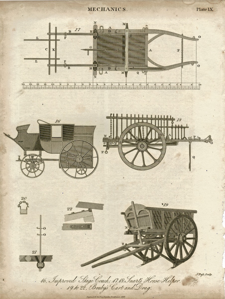 Improved Stage Coach, Smart’s Horse Helper, Braby’s Cart and Drag, 1816, cm. 26,5 x 20, Engraved for the Encyclopoesia Londinensis, 1816.