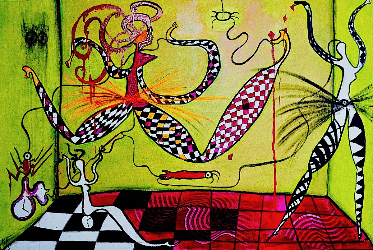La pièce des fils, mixed media on canvas, 92 x 62 cm., by Mary Blindflowers©
