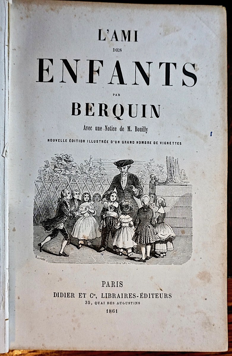 L’Ami des enfants par Berquin avec une Notice de M. Boully, Nouvelle Edition Illustrée d’un Grand Nombre de Vignettes, Paris, Didier & C., Libraires-Editeurs 35, Quai des Augustins, 1861, pp. 520, numerous print and Illustrations. Hard cover, golden cuts.