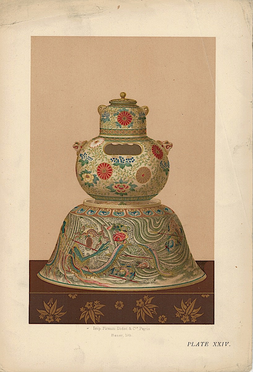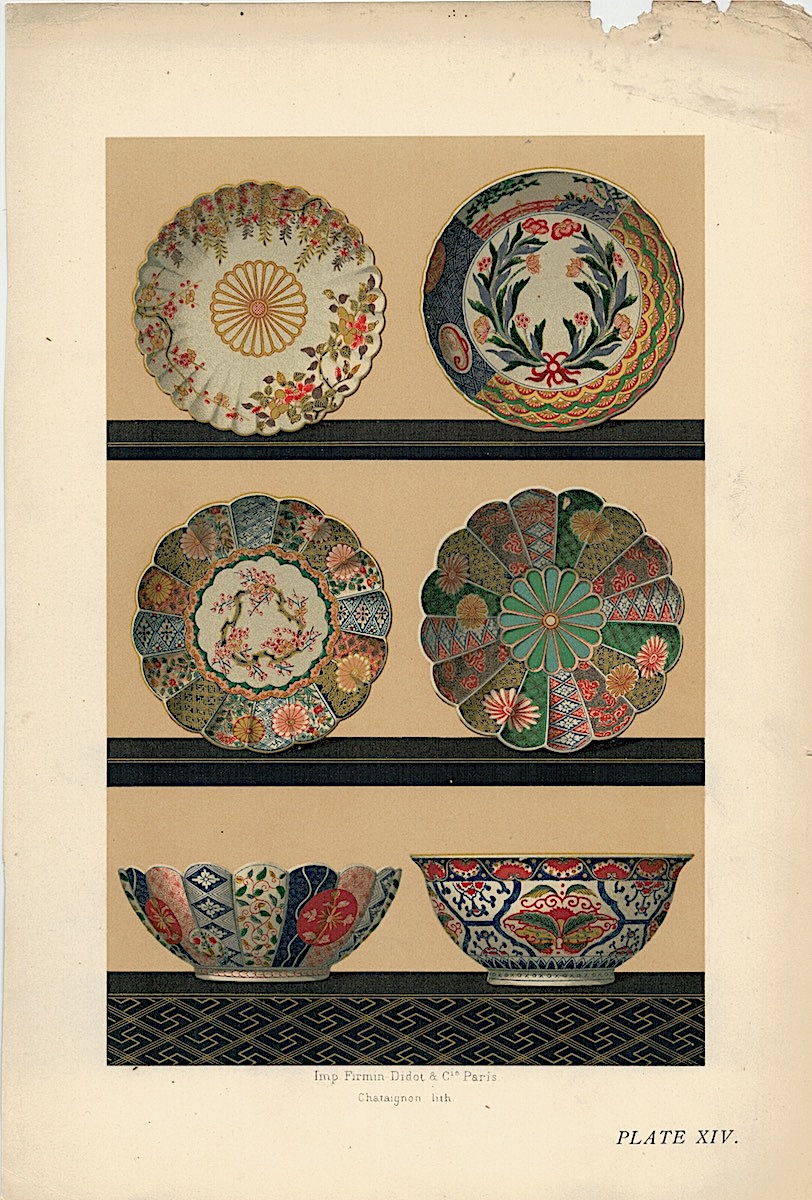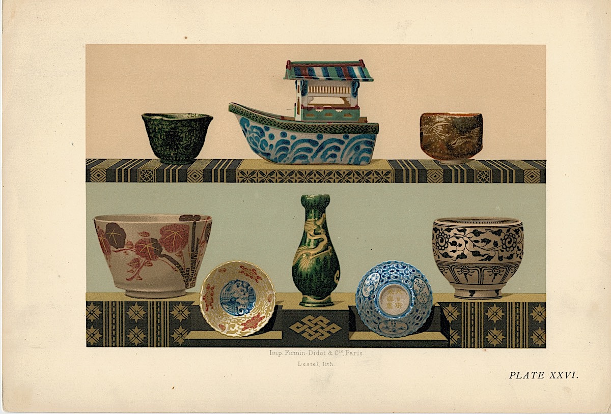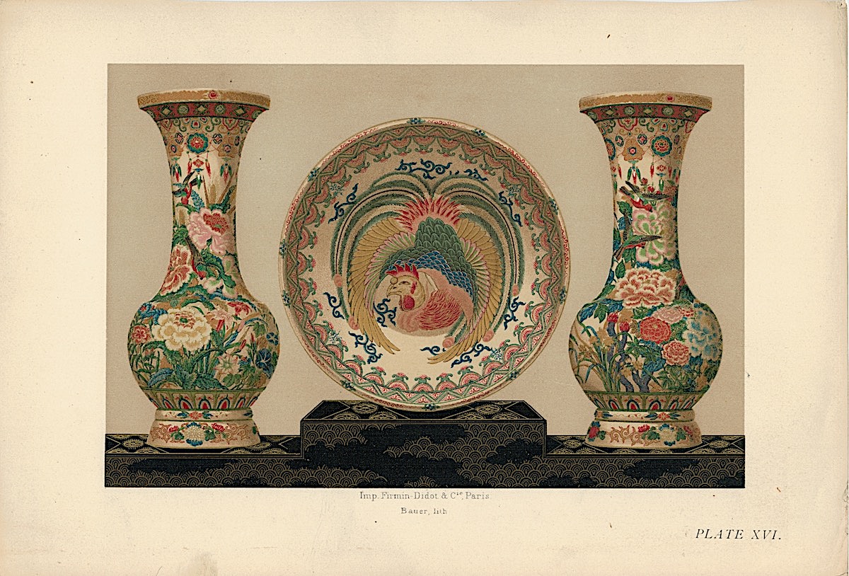 Lot of 15 Colour Chromolithographs from “Keramic Art of Japan”, 1881, credit Antiche Curiosità©