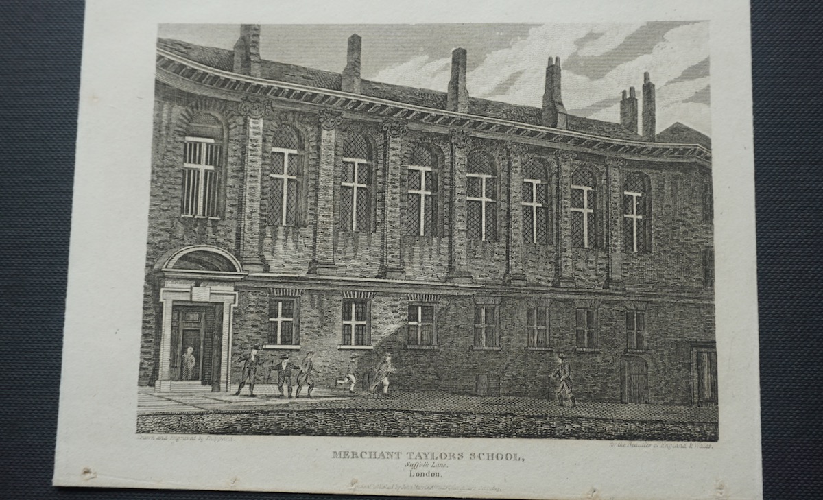 London : John Harris, 1815. An antique print – the principal facade of the original Merchant Taylors’ School in Suffolk Lane near Cannon Street Station – the school long since removed to Northwood. Drawn and engraved by George Sidney Shepherd and originally produced for the part-work “Beauties of England and Wales” (London : 1801-1816).