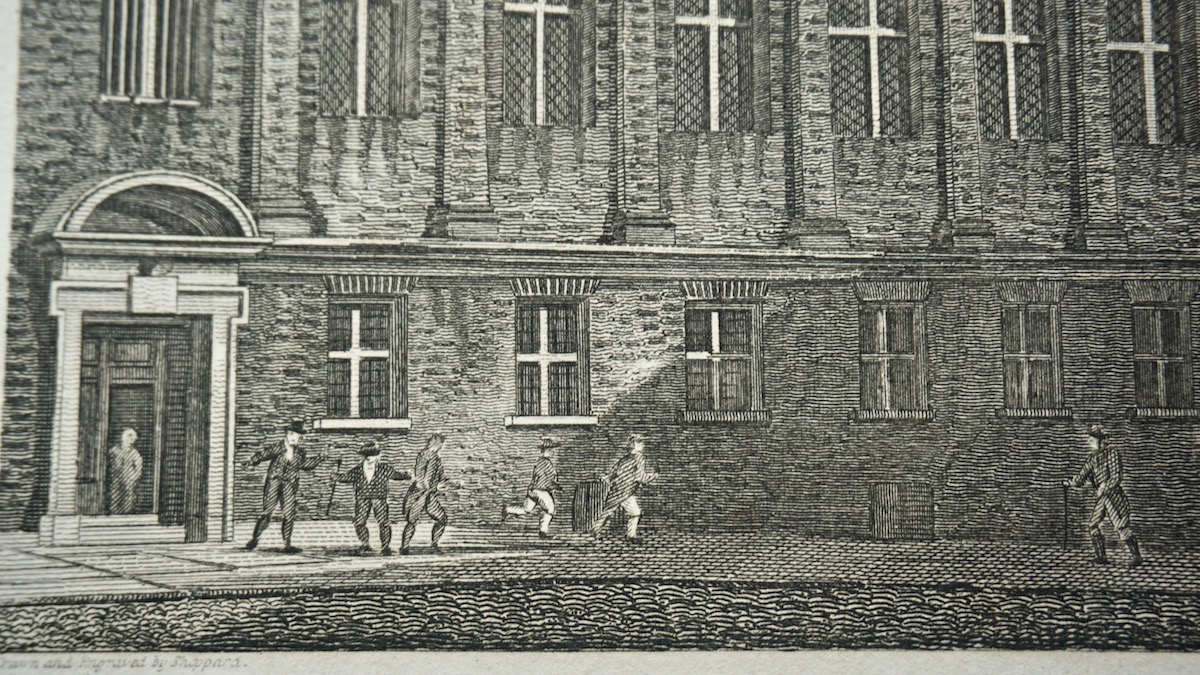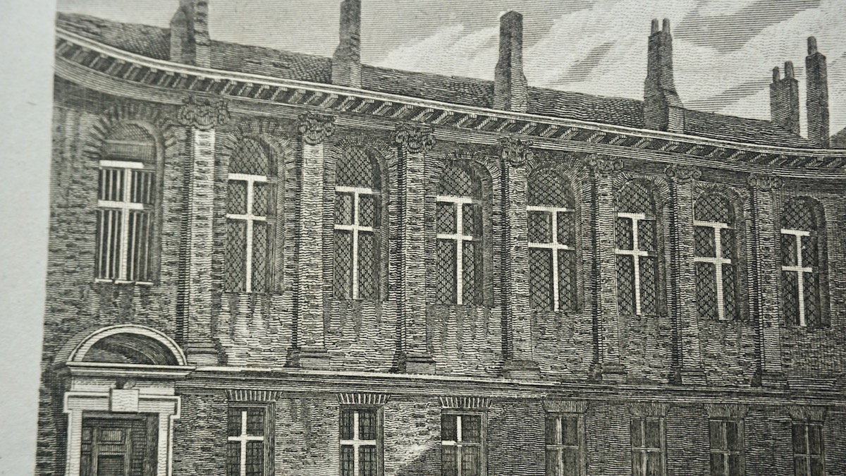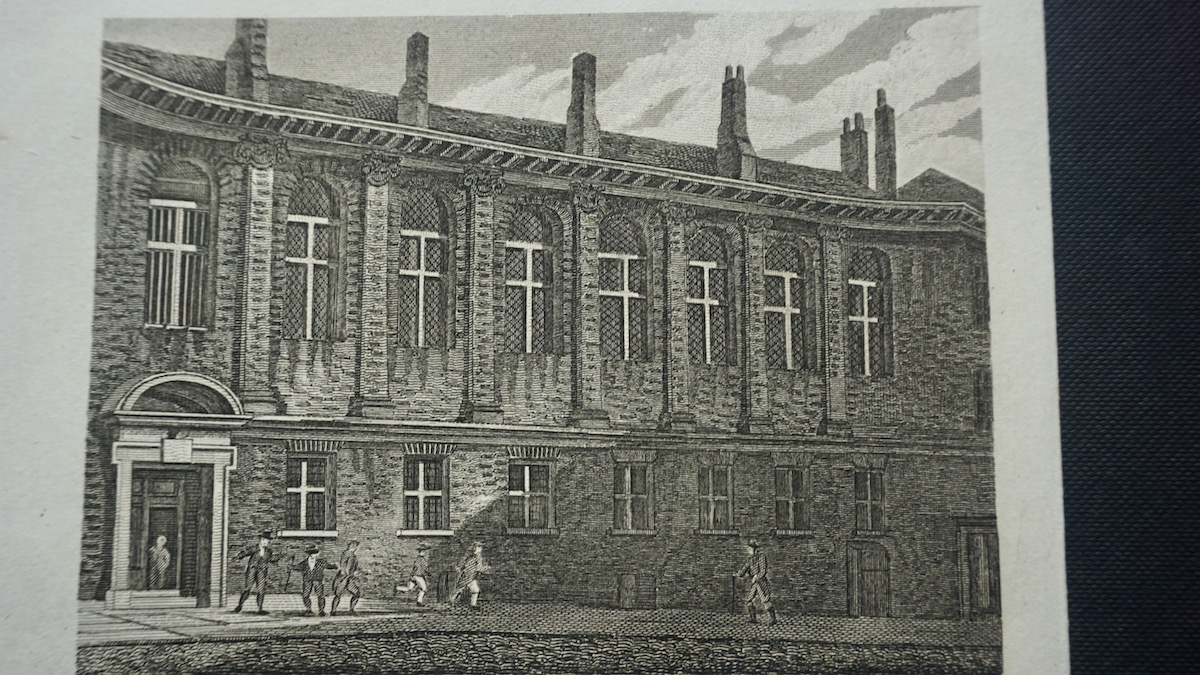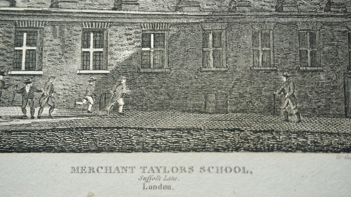 Merchant Taylors School, Suffolk Lane, London, antique engraving print 1815, credit Antiche Curiosità©