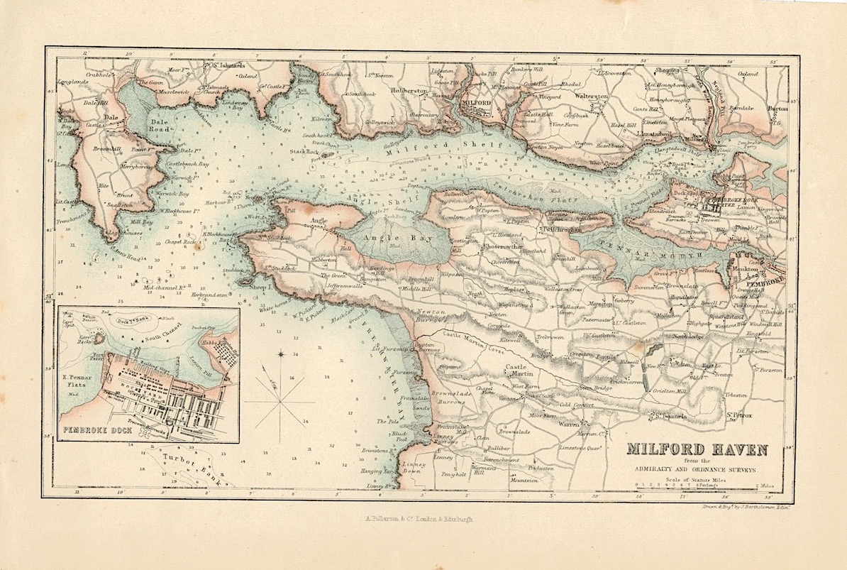 Milford Haven, Antique sea map, Pembrokeshire. Bartholomew, 1865, credit Antiche Curiosità©