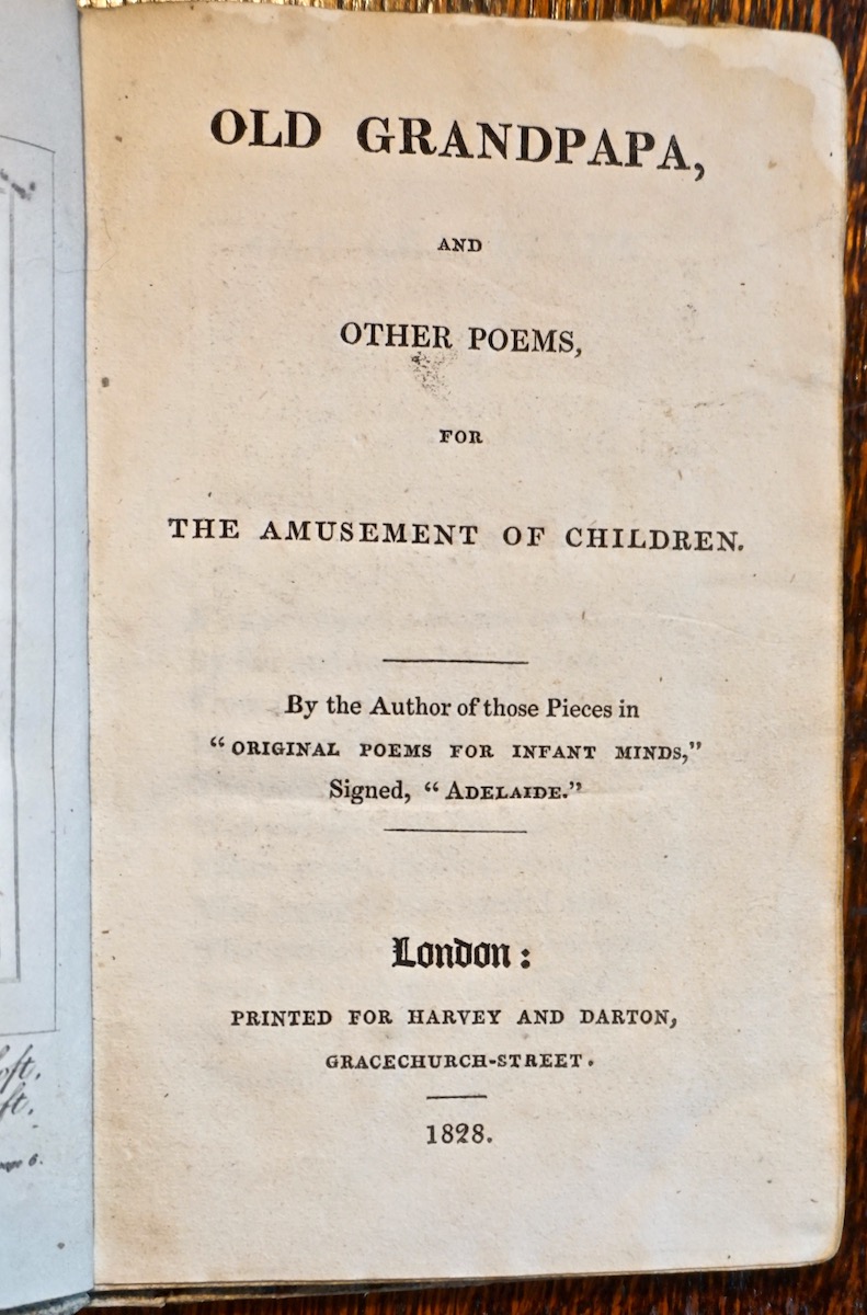 Old grandpapa and other poems for the amusements of children, London, 1828, London, printed for Harvey and Darton, Gracechurch-street, 1828, pp. 51. Three miniatures. Original Hard cover. Rare.