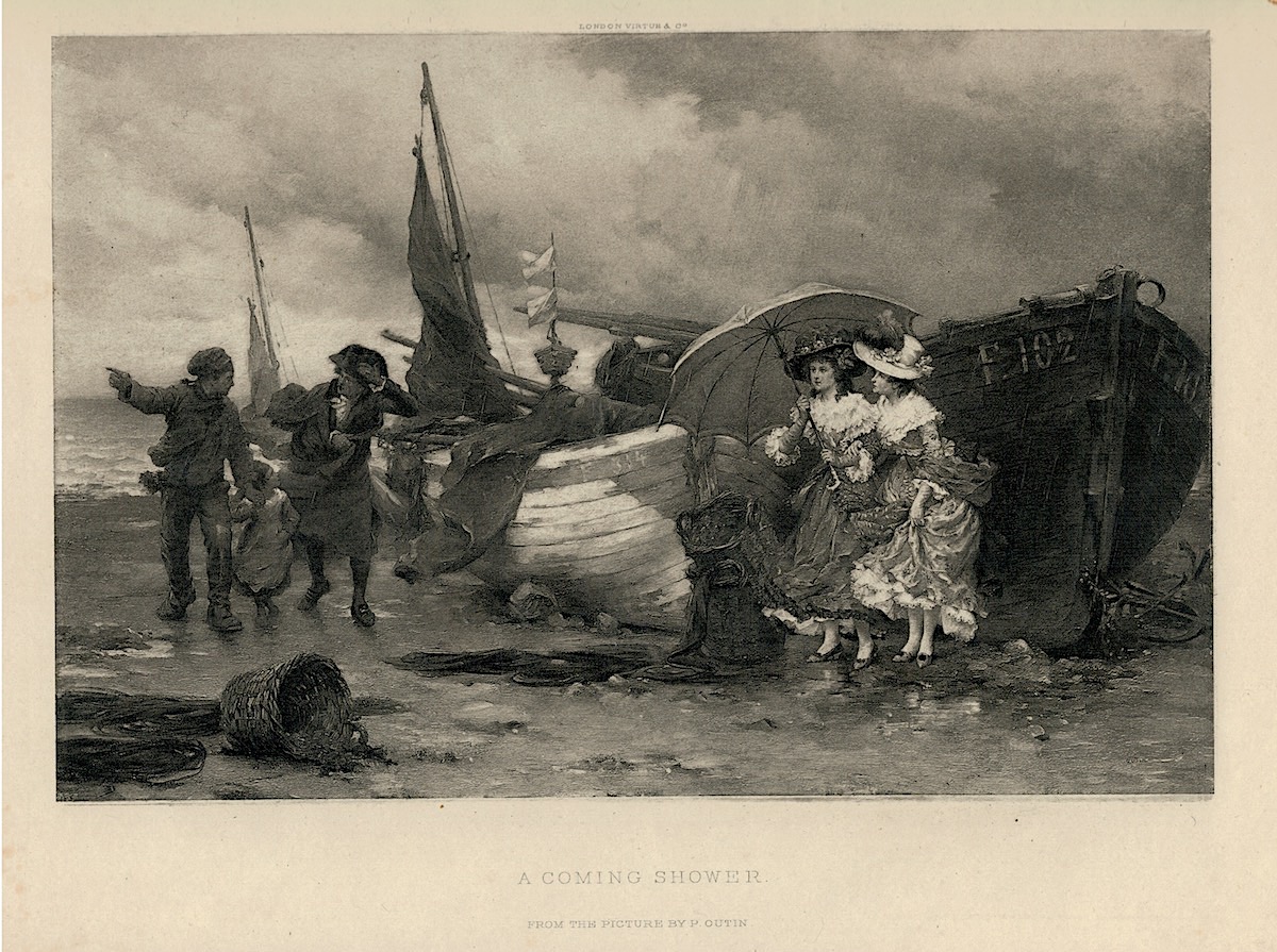 Rare Antique Engraving Print, A Coming Shower, 1840 ca., from The Pictures by P. Outin, 31,5 x 25,4.