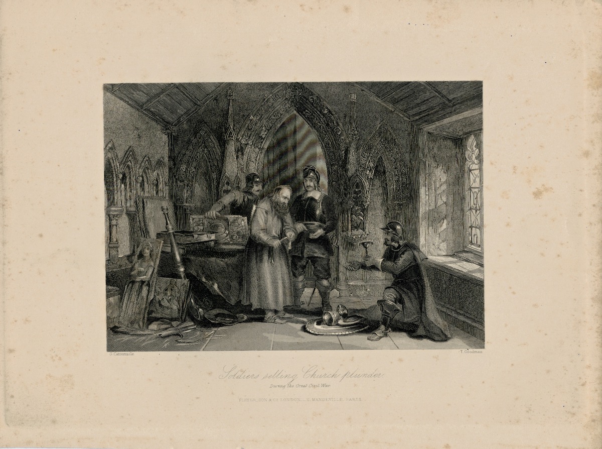 Three soldiers and priest in gothic room, one soldier kneeling on the right and holding chalice towards priest, the two soldiers standing behind; after Cattermole; illustration to his ‘Common Wealth’ (volume I); Engraving with etching, printed on chine collé.