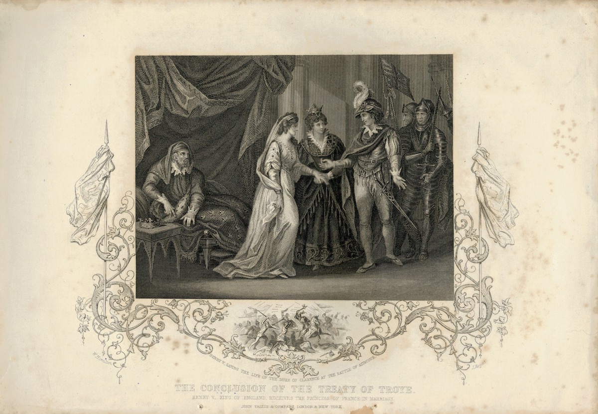 Rare Antique Engraving Print, The Conclusion of the Treaty of Troye, and Henry V. Saving, The Life of the Duke of Clarence at the Battle of Azincour, John Tallis & Company , London & New York, 1850, cm. 28 x 19,5.