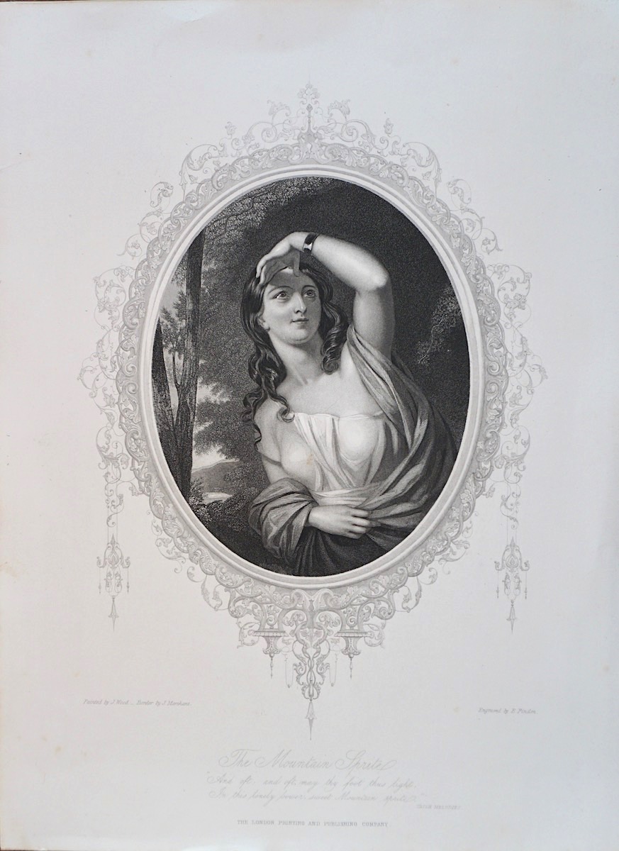 Antique Engraving Print, The Mountain Sprite, 1846, And oft, and oft may thy foot thus light,/ In this lonely lower sweet, Mountain Sprite (Thomas Moore), engraved by E. Finden, 36,2 x 26,6 cm.