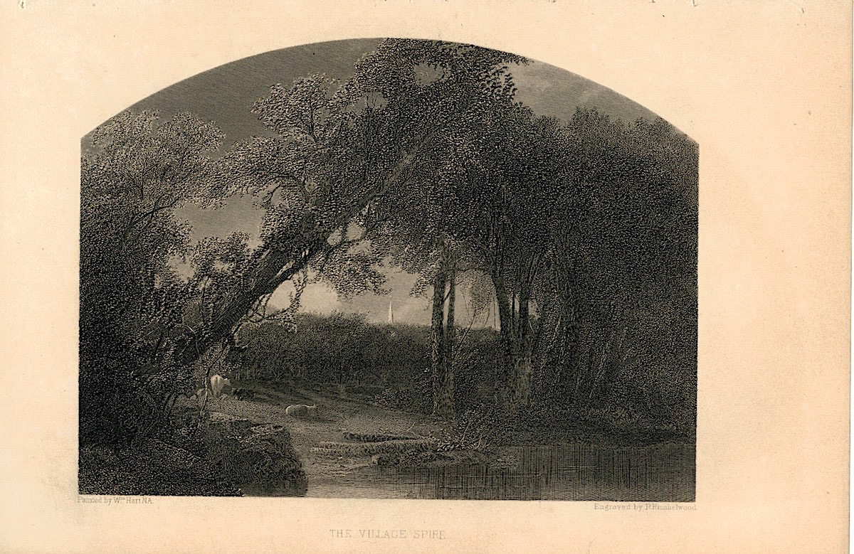 Rare Antique Engraving Print, The Village Spire, 1840 ca., 22,6 x 15 cm. Engraved by R. Hinshelwood.