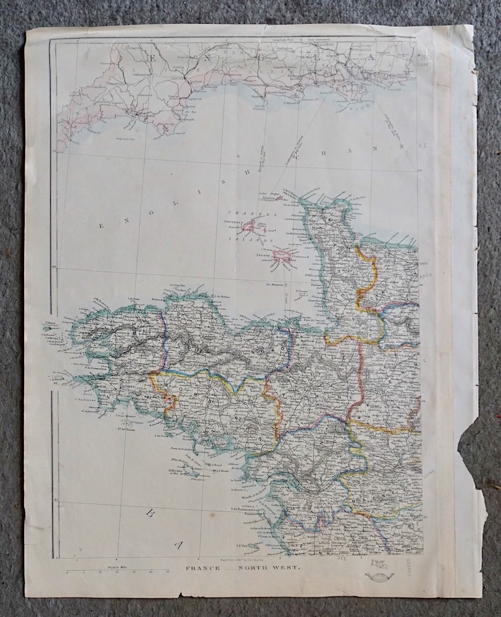 Rare Antique Map, France, North West, 1850 ca. 46,5 x 36,5 cm.