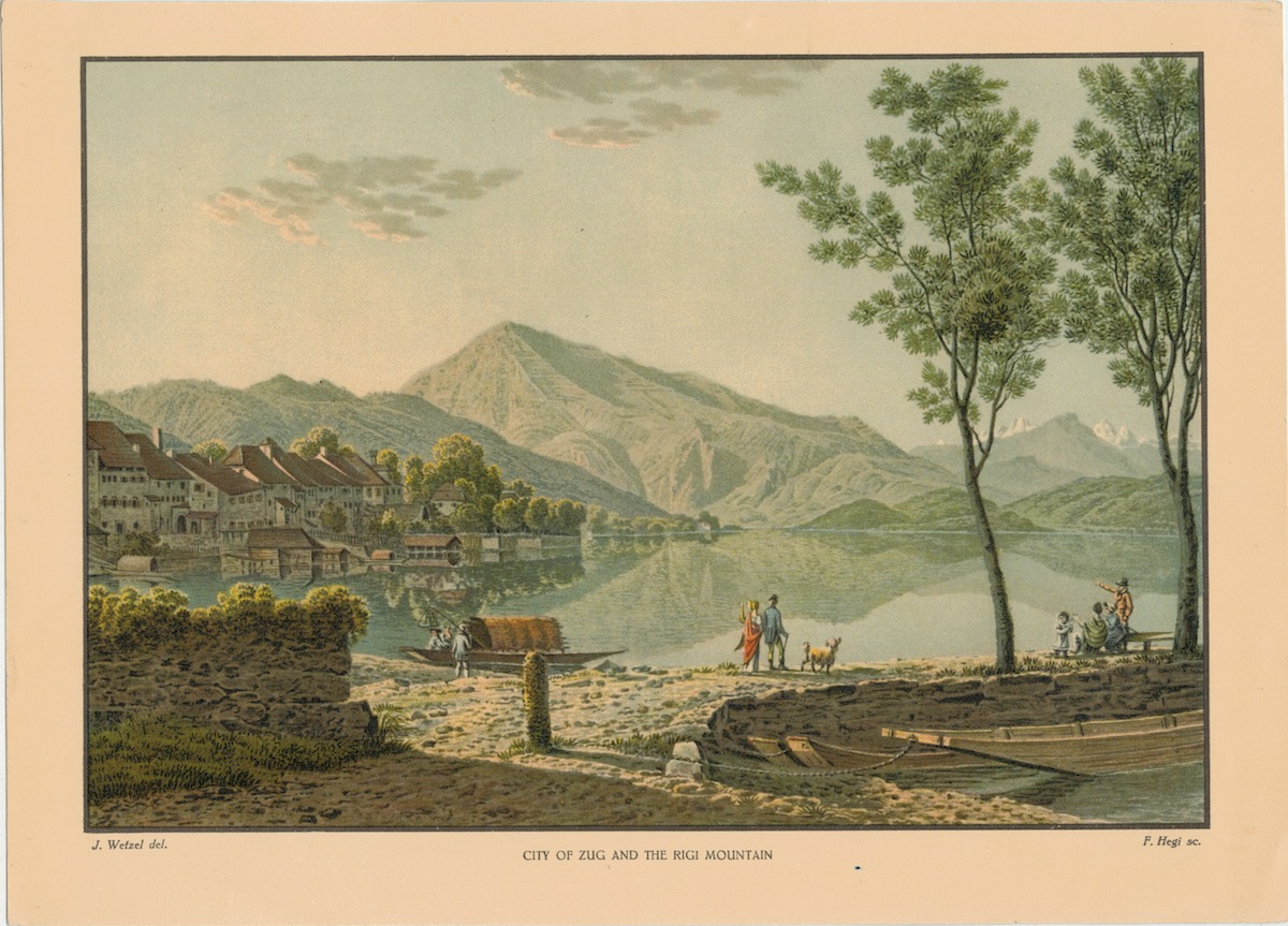 Rare Antique Print, City of Zug and the Rigi Mountain, 1880, credit Antiche Curiosità©