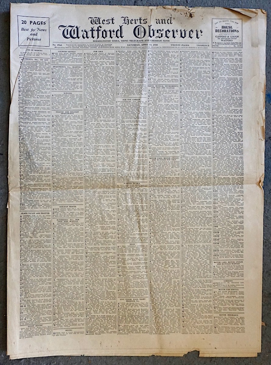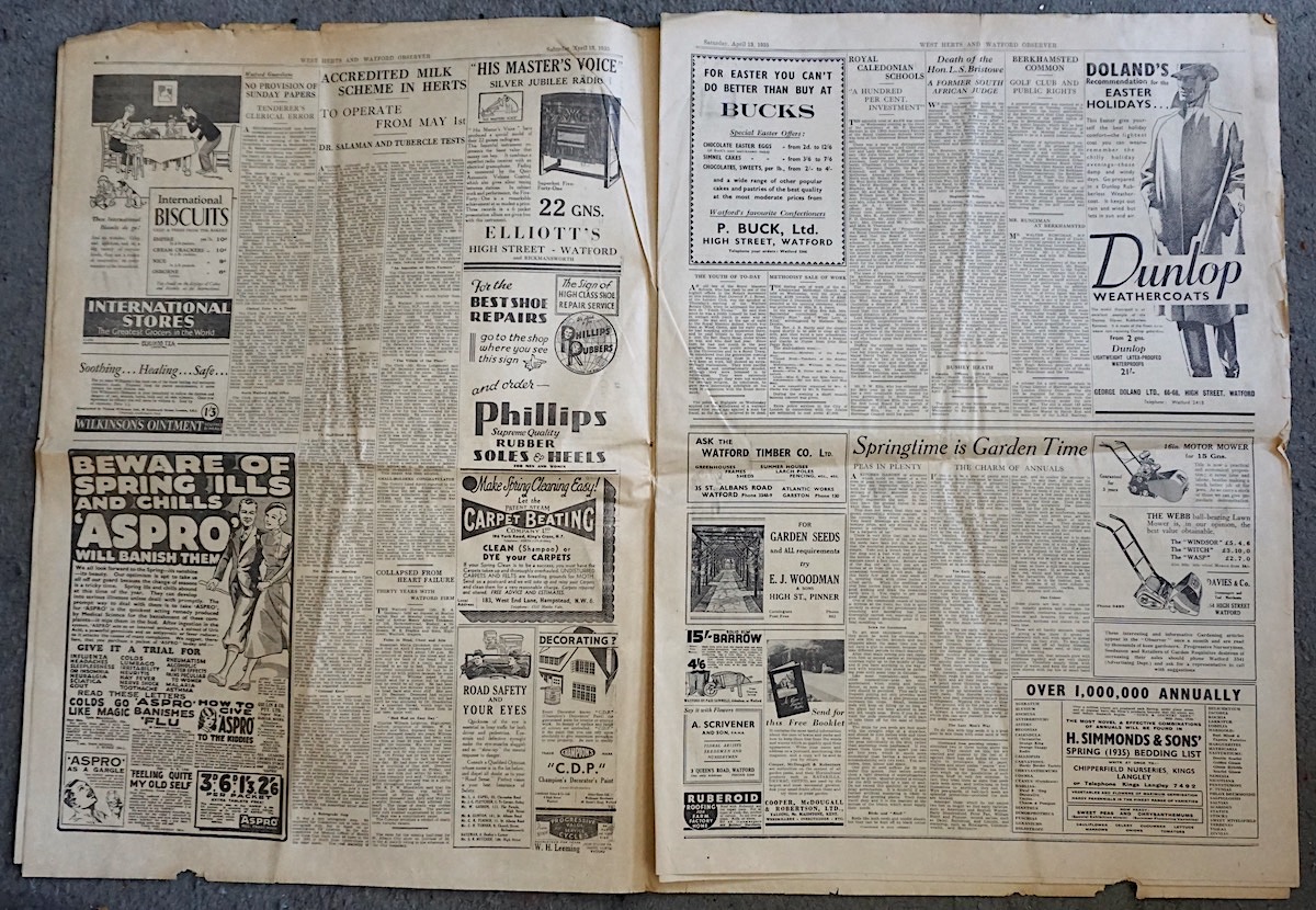 Rare Original West Herts & Watford Observer, Saturday, April 13, 1935, 59 x 43 cm.