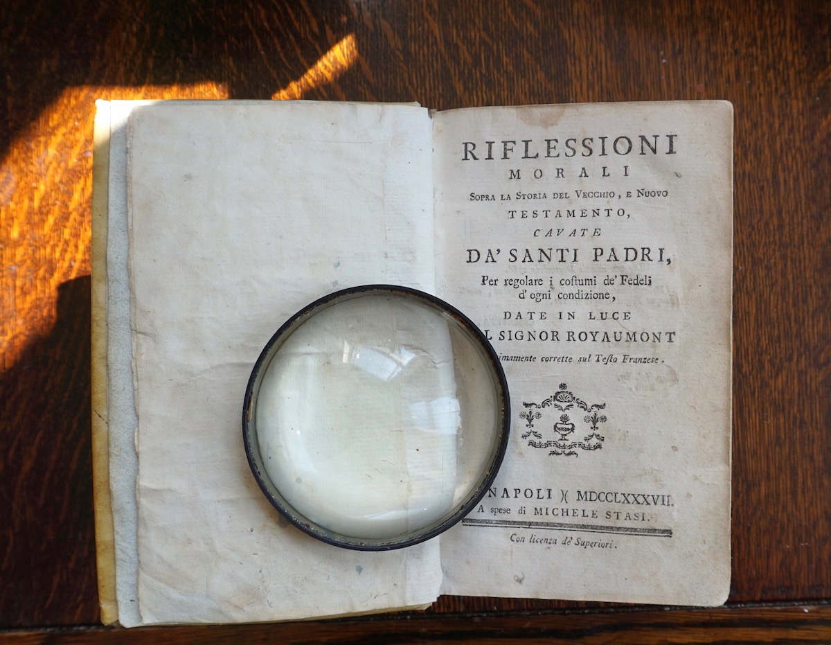 Riflessioni morali sopra la storia del Vecchio e Nuovo Testamento cavate da’ Santi Padri, per regolare i costumi de’ Fedeli d’ogni condizione, date in luce dal Signor Royaumont ed ultimamente corrette sul Testo Franzese, in Napoli, a spese di Michele Stasi, 1787, hard cover in parchment, 528 pages. Several engravings.