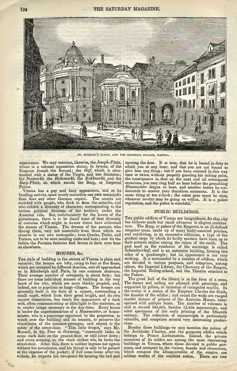 Antique Engraving Print, St. Michael’s Place and the Imperial Palace, Vienna, 1834, From The Saturday Magazine, Supplement for March, 1834, cm. 28 x 18.