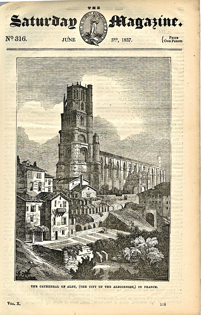 Antique Engraving Print, The Cathedral of Alby (the city of the Albigenses), in France, From Saturday Magazine n° 316, June 3 RD., 1837, vol. X, p. 316, cm. 28 x 18.