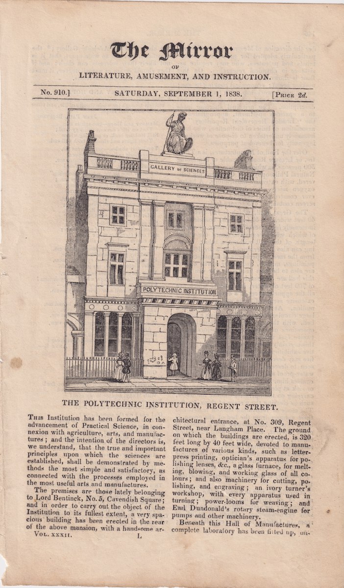 The Mirror, Frontispiece, 1838, The Polytechnic Institution, Regent Street, credit Antiche Curiosità©