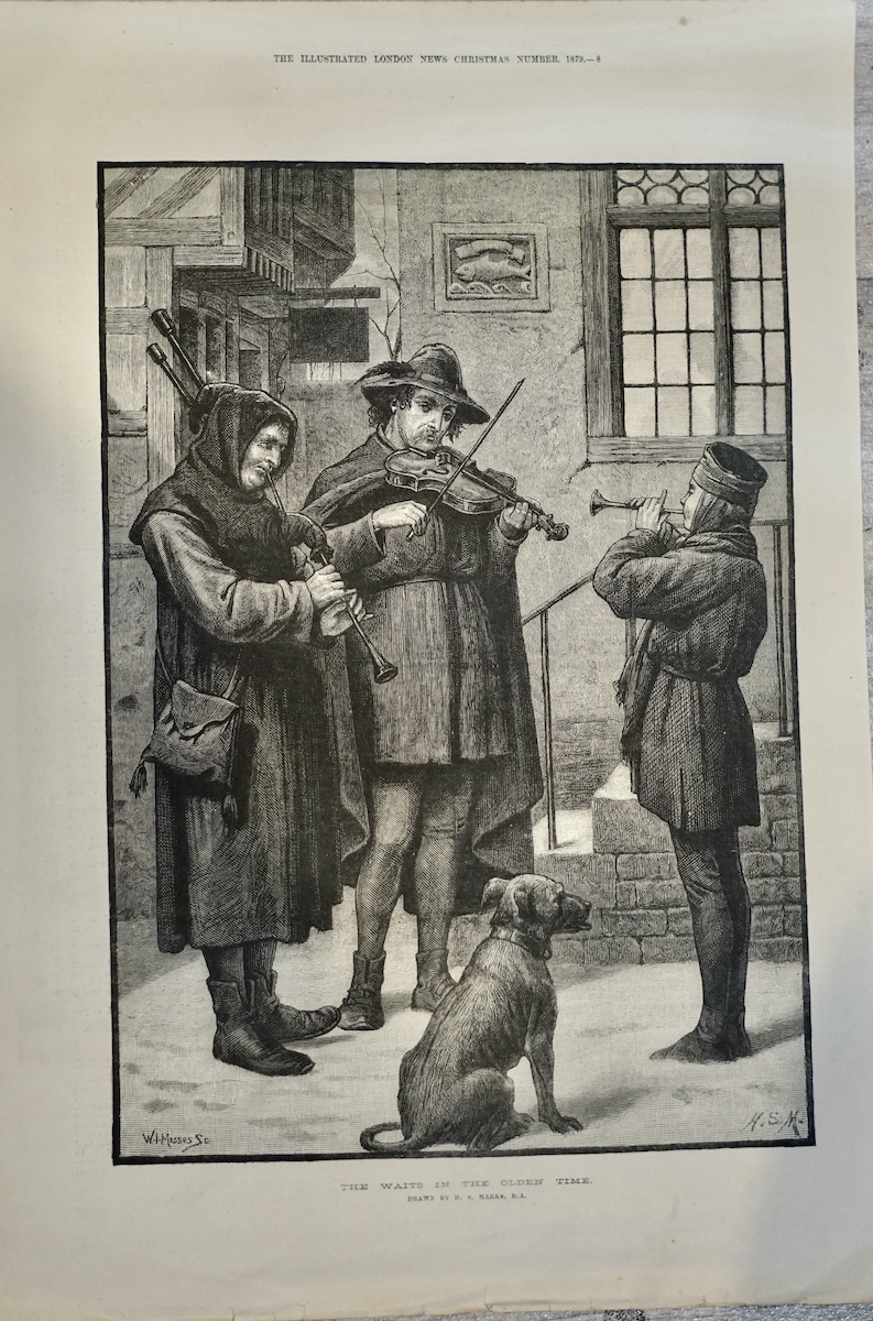 Beautiful 19th-century print from The Illustrated London News – Christmas Number 1879. Titled “The Waits in the Olden Time”, it depicts a group of street musicians performing in a winter setting — a violinist, two wind players, and a loyal dog listening at their feet. Drawn by artist W. H. J. Boot, this nostalgic scene captures the warmth and charm of traditional Christmas music in Victorian England. A perfect collectible for lovers of history, art, and the festive season, 27 x 40 cm.
