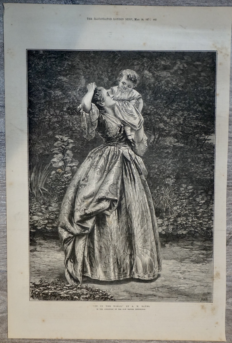 Beautiful original antique engraving taken from The Illustrated London News, dated May 18, 1872. Titled “Up in the World” by A. W. Bayes, this charming Victorian scene depicts a mother lifting her child in a tender and joyful moment, surrounded by lush garden foliage.