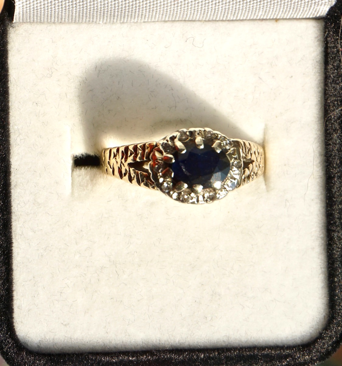 Vintage 9c. gold ring, sapphire and diamonds, signed, size J.