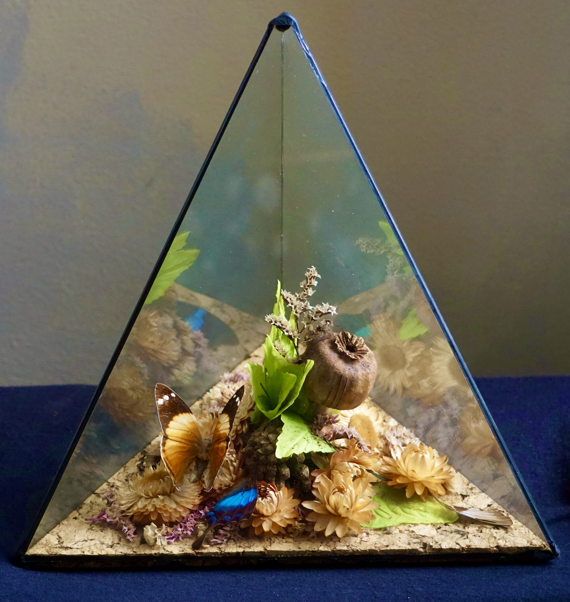 Vintage Butterflies Taxidermy Triangular Terrarium, 30 x 26 cm. Glass display. Hand made.
