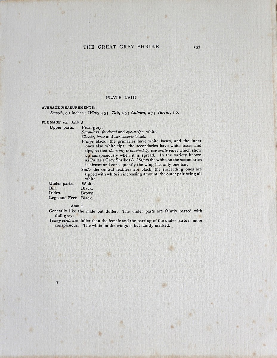 Vintage Engraving Print, The Great Grey Shrike, by Medland Lilian Marguerite, 1906, 32 x 25 cm. With explanation card.