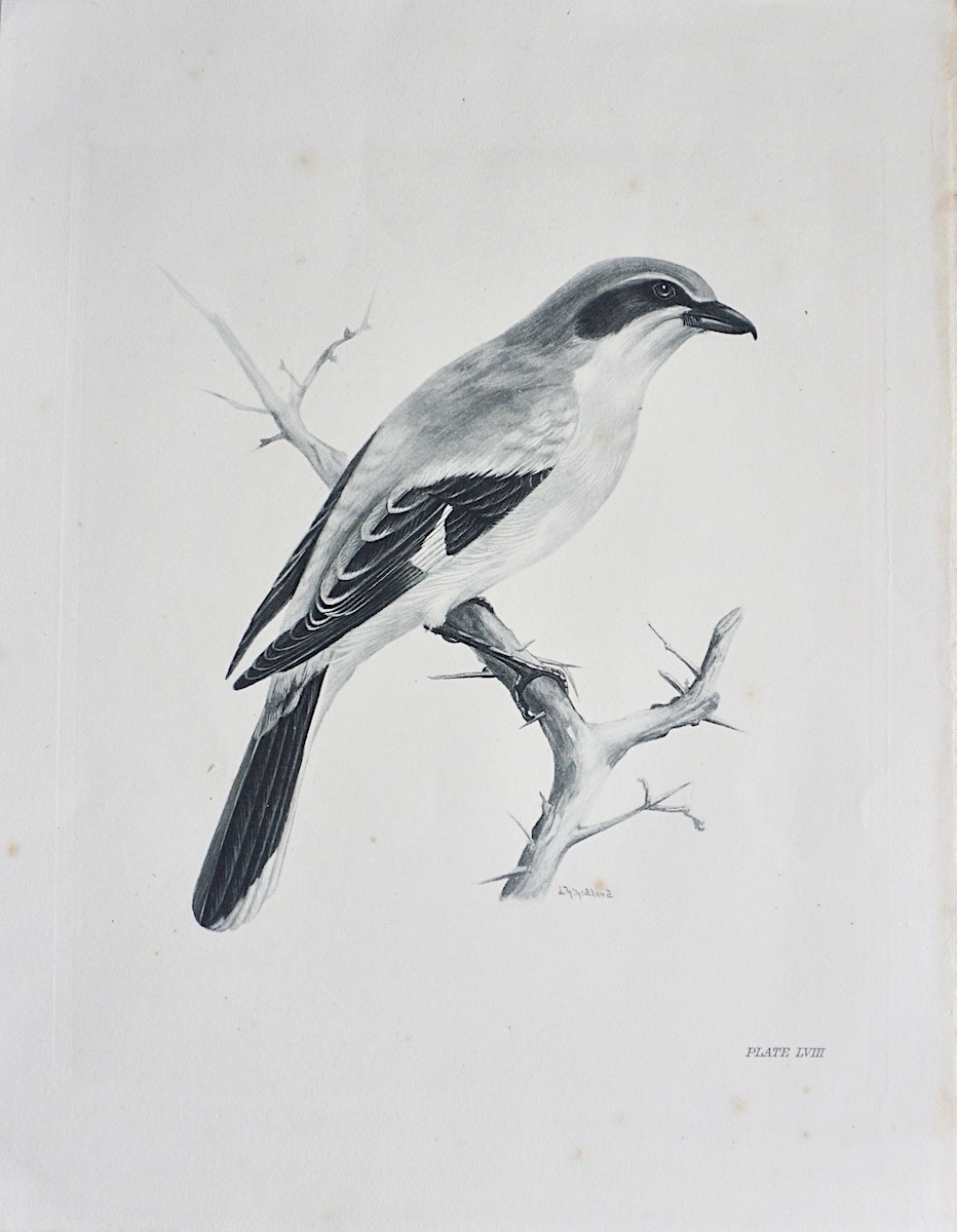 Vintage Engraving Print, The Great Grey Shrike, by Medland Lilian Marguerite, 1906, credit Antiche Curiosità©