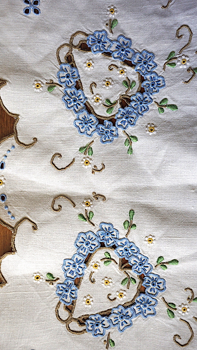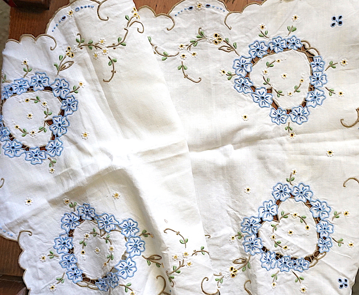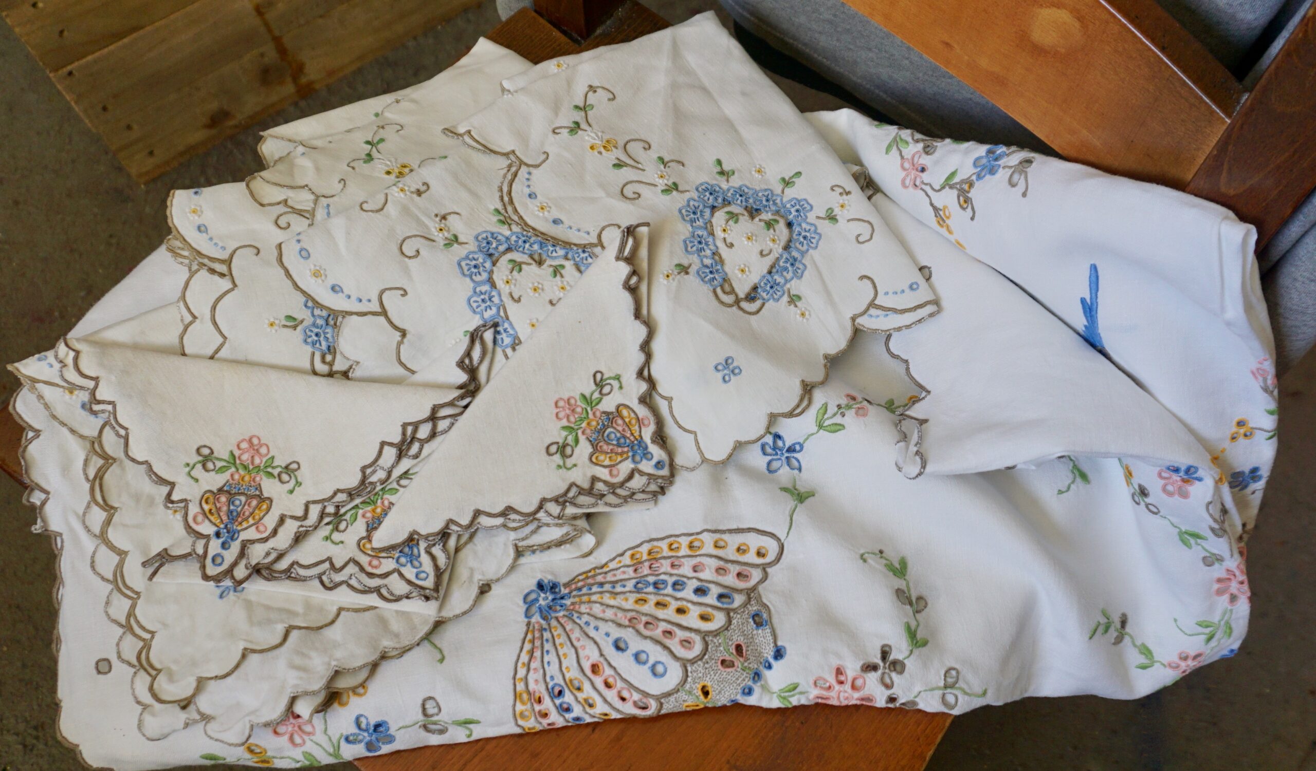 Vintage Handwork set carving embroidery, linen tablecloth, placemats and napkins