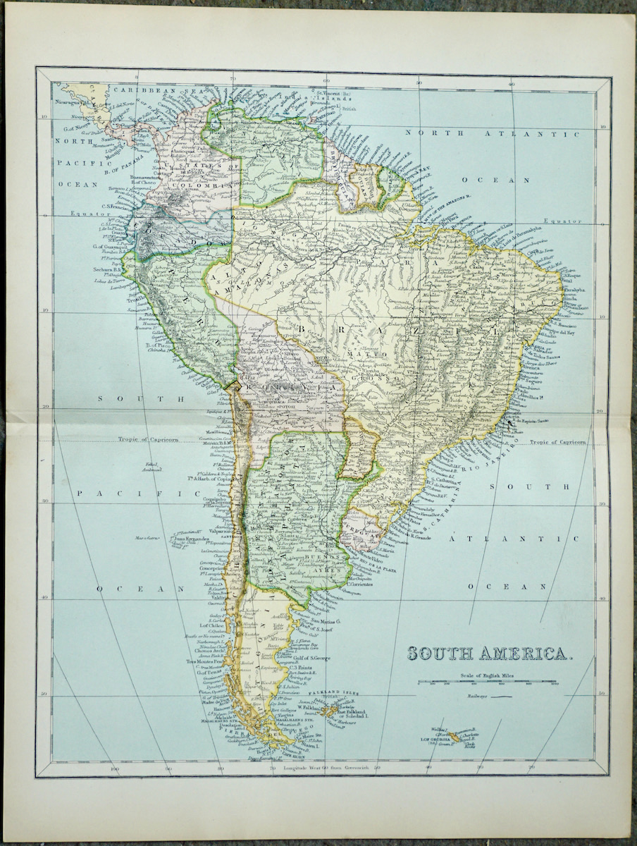 Vintage Map, South America, 1901, 33.5 x 35.4 cm.