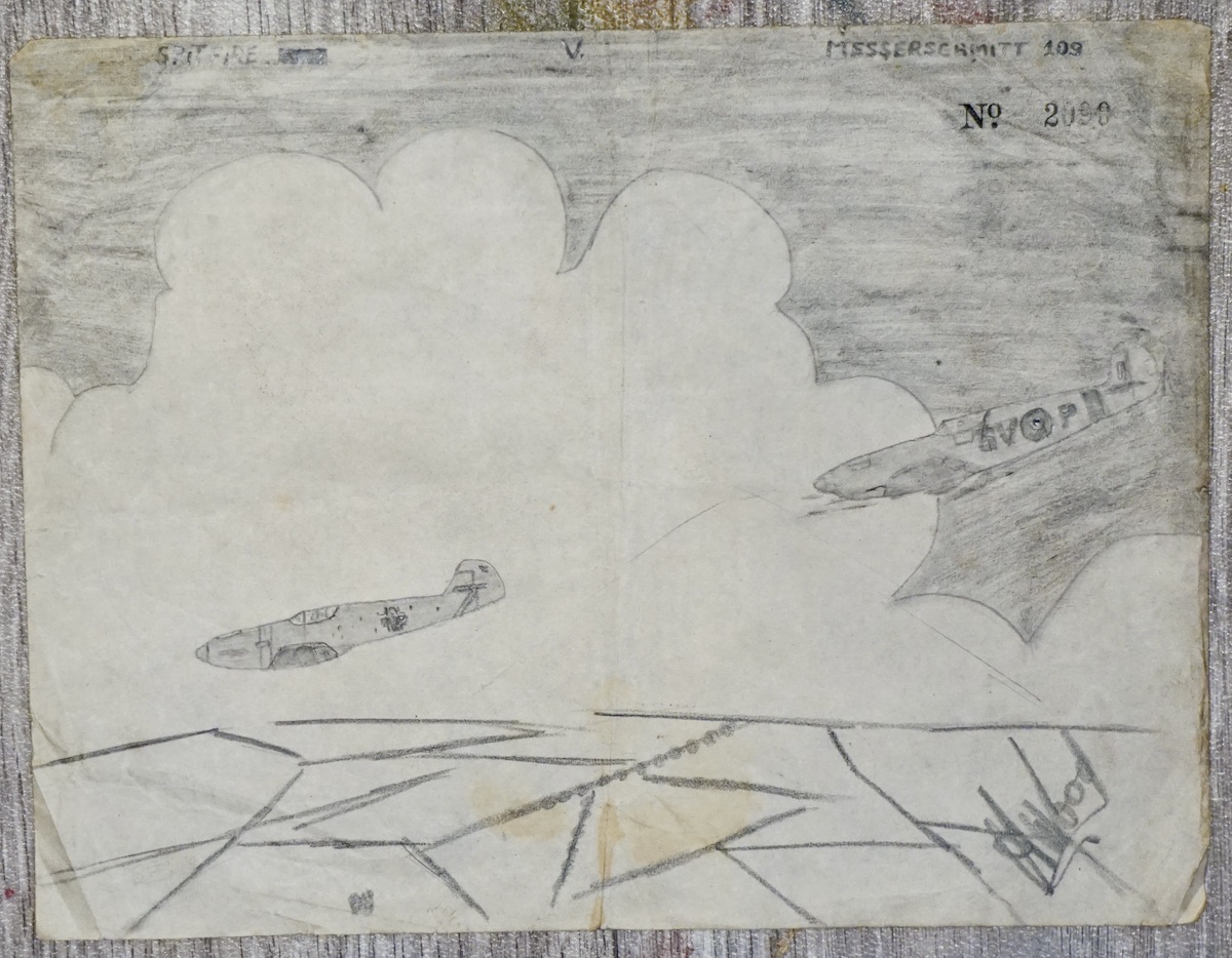 Vintage Pencil drawing on paper, Spitfire, 22.7 x 17.5 cm.