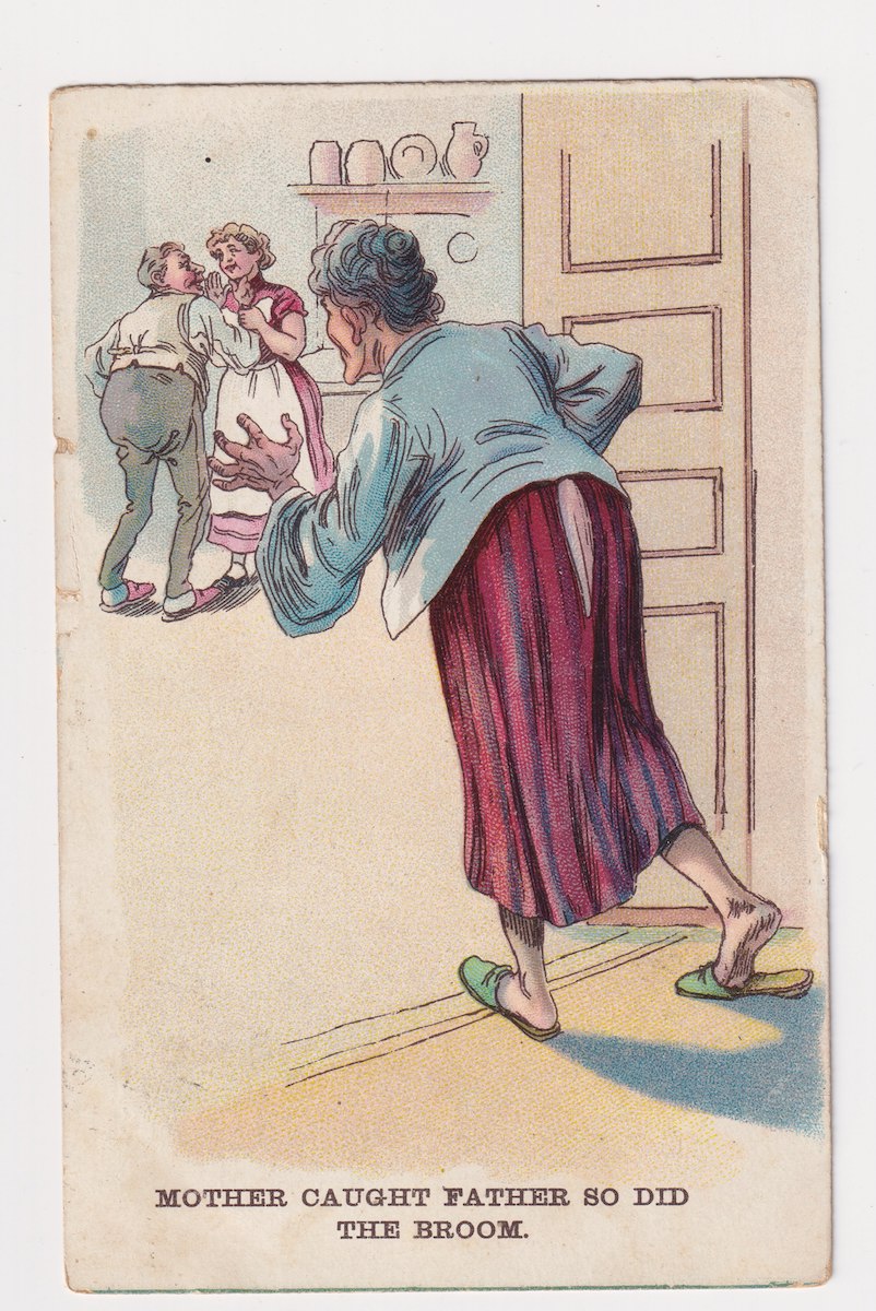 Vintage Postcard, Mother caught father so did the broom, 1909, credit Antiche Curiosità©