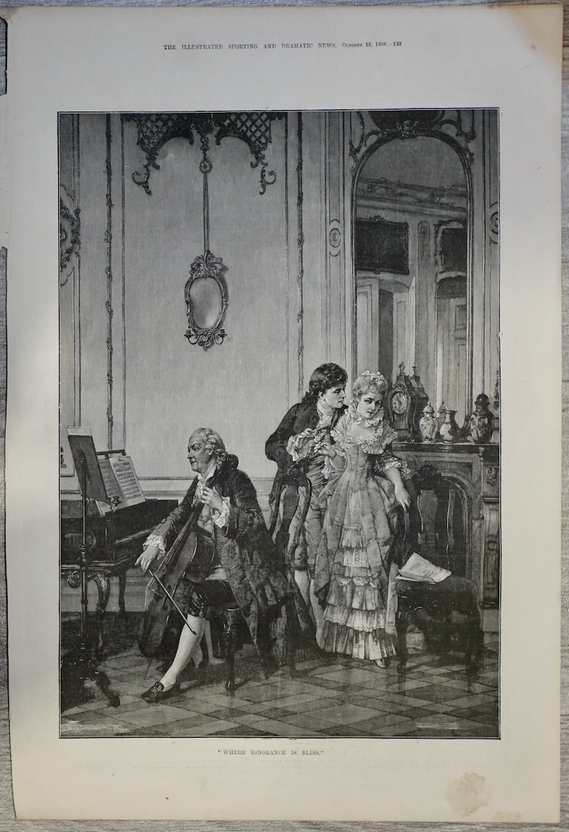 Elegant antique print from The Illustrated Sporting and Dramatic News (December 1888), depicting a refined 18th-century interior scene. The illustration shows a cellist absorbed in performance, while a young aristocratic couple stands nearby, sharing a subtle, intimate interaction that adds narrative depth to the composition. The setting is richly detailed, with ornate mirrors, paneling, and decorative objects that evoke the elegance of the period.