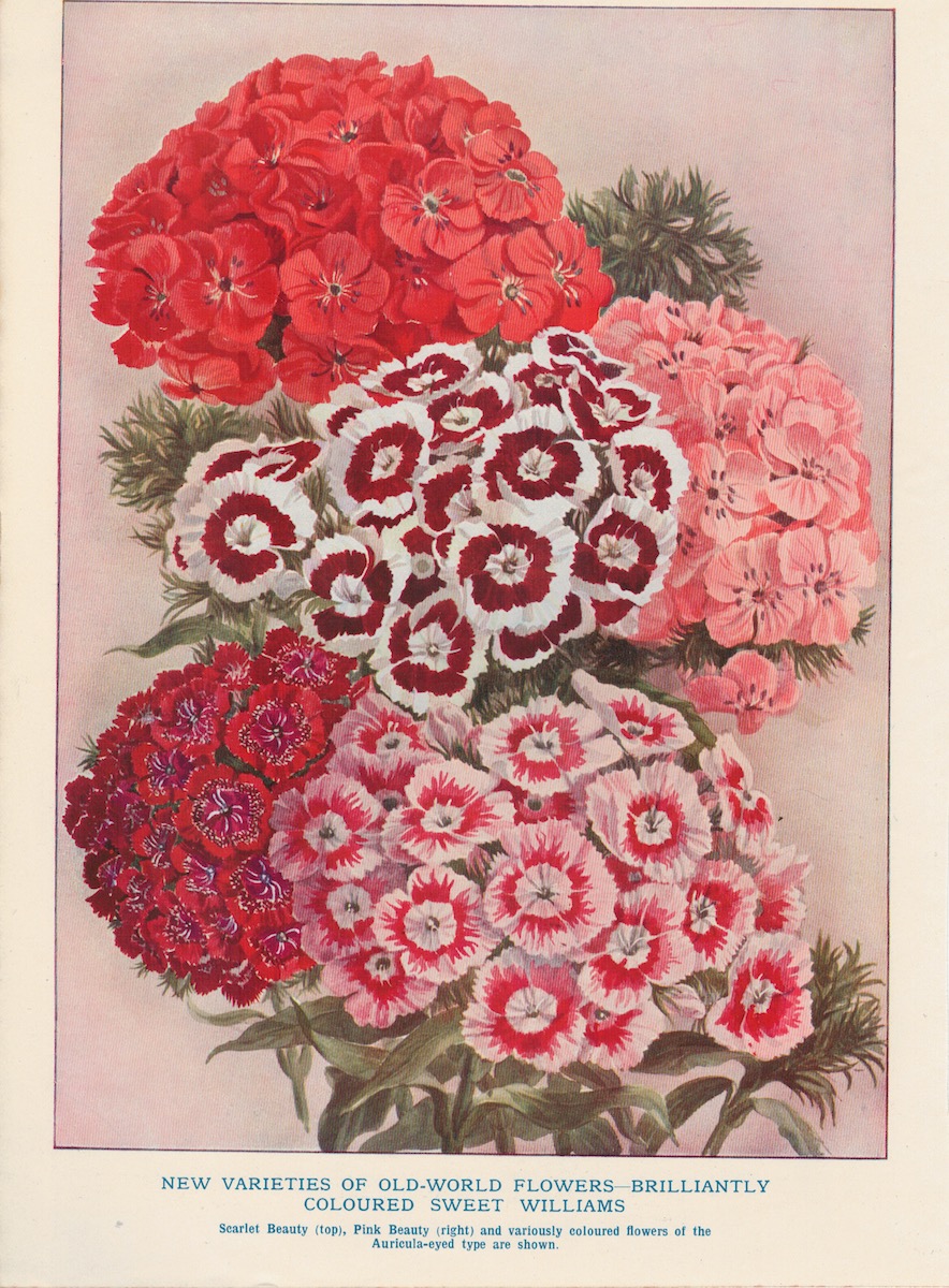 Vintage Print, New Varieties of Old-World Flowers-Brilliantly coloured Sweet Williams, Scarlet Beauty and variously coloured flowers of the Auricula-eyed are shown, 1890 ca., cm. 27 x 20.
