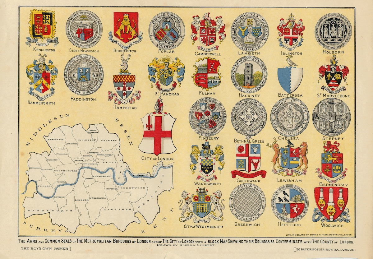 Vintage Print, The Arms and Common Seals of the Metropolitan Boroughs of London, 1903, credit Antiche Curiosità©