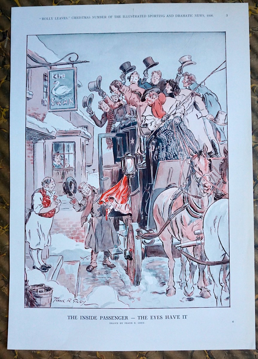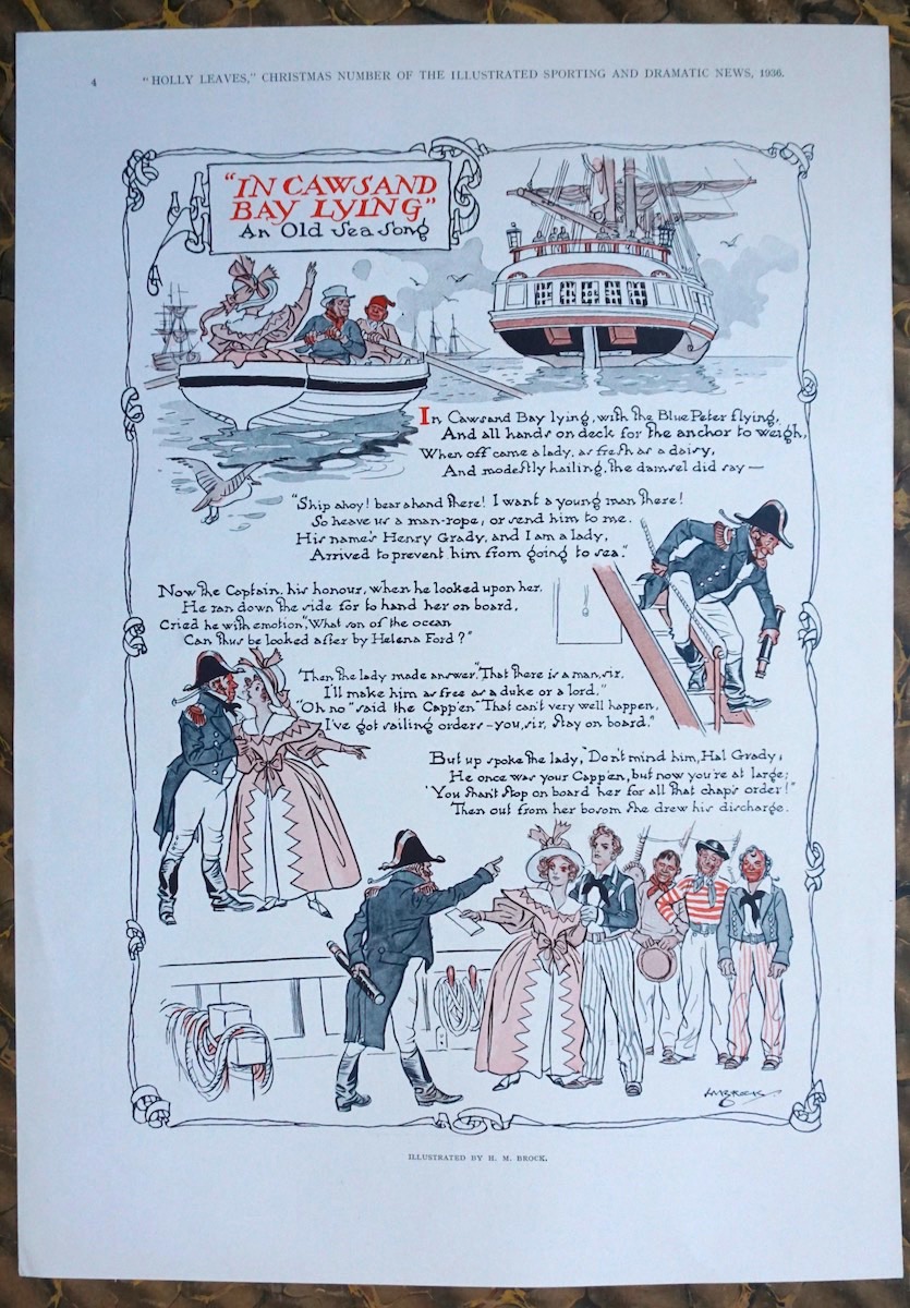 Vintage print, The inside Passenger, The Eyes have it, drawn by Frank R. Grey; In Cawsand Bay Lying, illustrated by H. Brock, from Christmas Number of the Illustrated Sporting and Dramatic News, 1936, 36,6 x 25,6 cm. Printed on both sides.