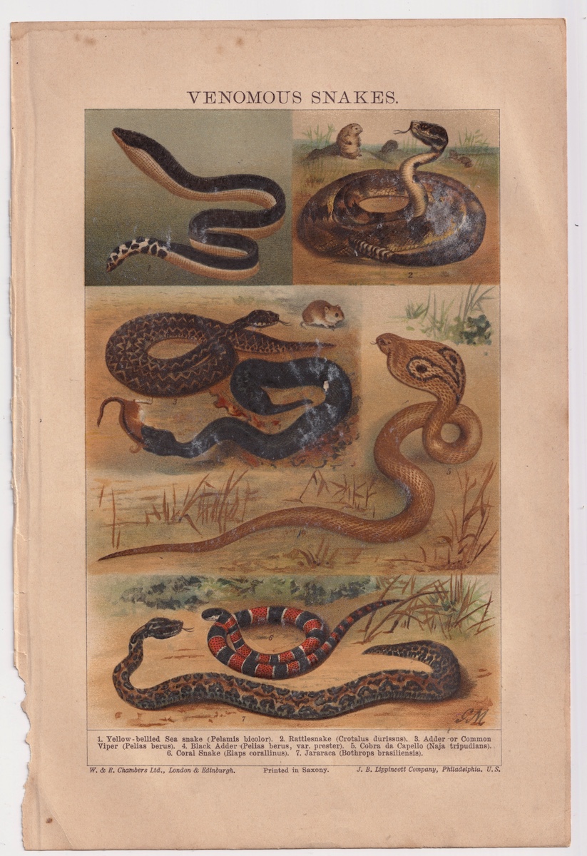 Vintage Print, Venomous snakes, 1895, 26.7 x 18 cm.
